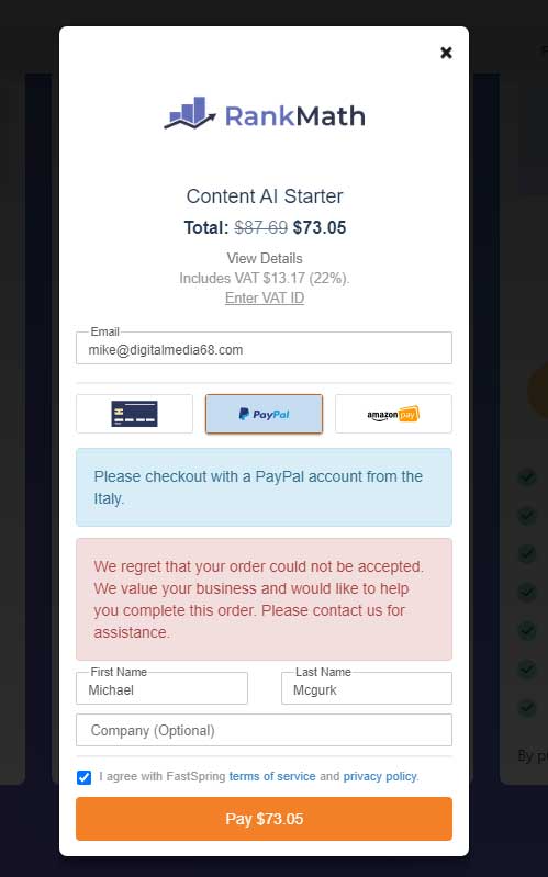 You are trying to purchase the plugin from Italy with a PayPal account that is not from Italy and that triggers a security flag in our payment provider.
