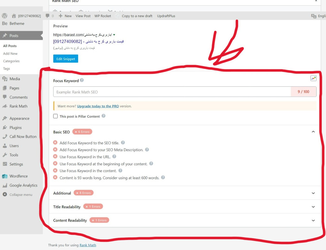 (section seo rank SEO: x / 100 & Focus Keyword & Basic SEO & Additional & Title readability & Content readability )