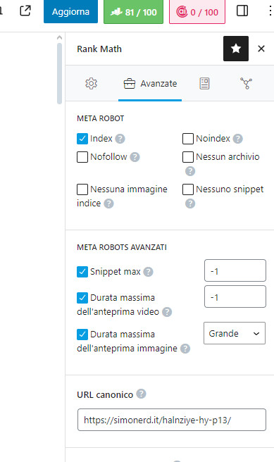 However, from your screenshot, the canonical is added twice. You should notice the canonical from Rank Math below with the URL: https://simonerd.it/halnziye-hy-p13/
