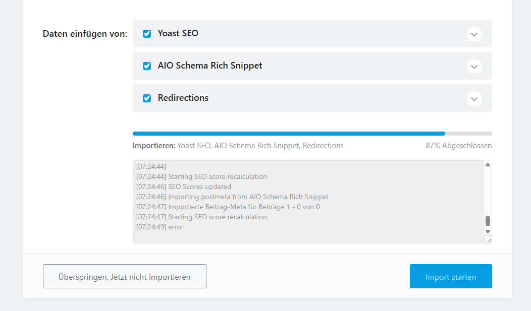 We apologize for the issue you are facing with the SEO score recalculation and the error during the import of old data from other plugins. This can sometimes happen due to various reasons, including plugin conflicts or issues with the data being imported.